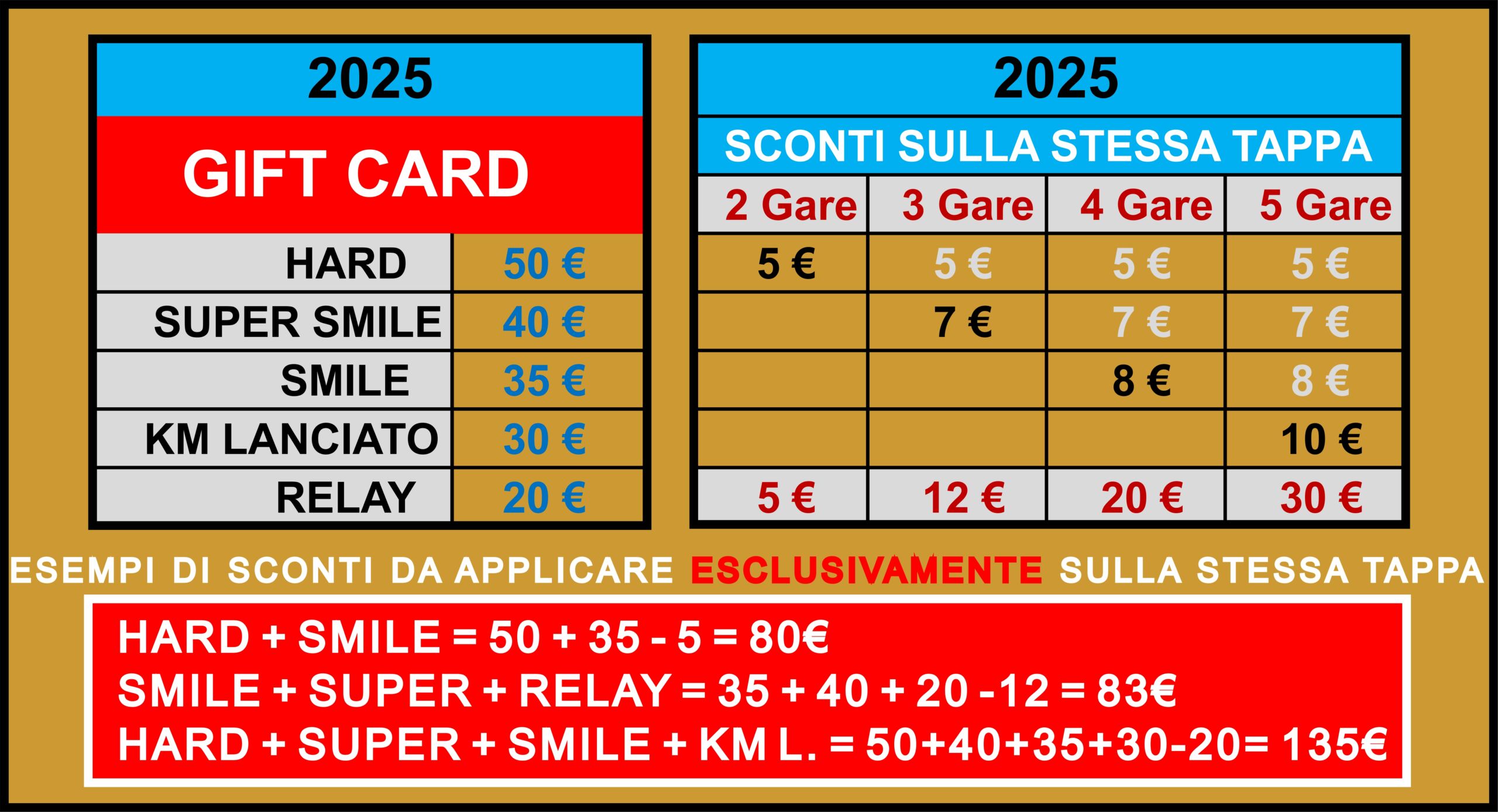 Scegli qui una o più gare col costo relativo (queste tariffe sono promozionali e valide per i primi 50 iscritti ad ogni tappa) :
